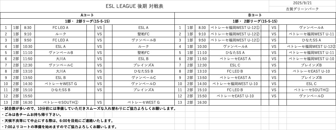 U-12 ESL LEAGUE 1部・2部 後期開幕戦
